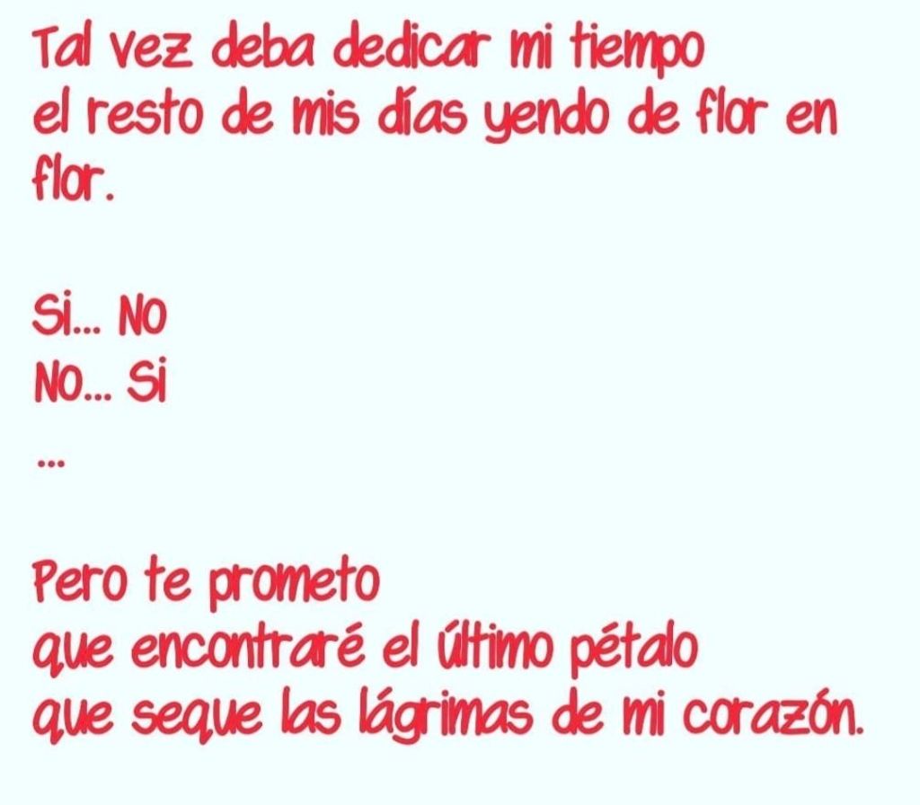Aún teniendo que deshojar todas las flores de tu jardín… Descubriré, ese pétalo que al voltearlo, sus palabras lo expresen todo lo que deseo… «Te quiero».